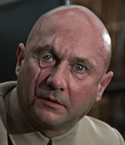 Yup, the same Blofeld who sported a hideous scar in “You Only Live Twice” (1967). That's Donald Pleasence with prosthetic makeup and the vintage Nehru Jacket.